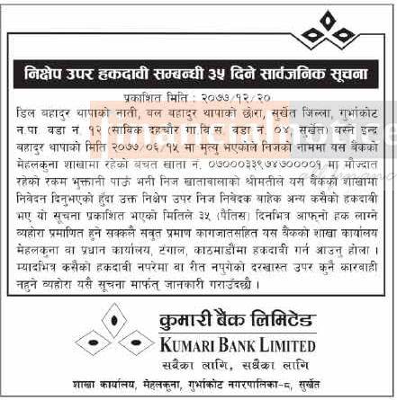 निक्षेप उपर हकदावी सम्बन्धी ३५ दिने सूचना