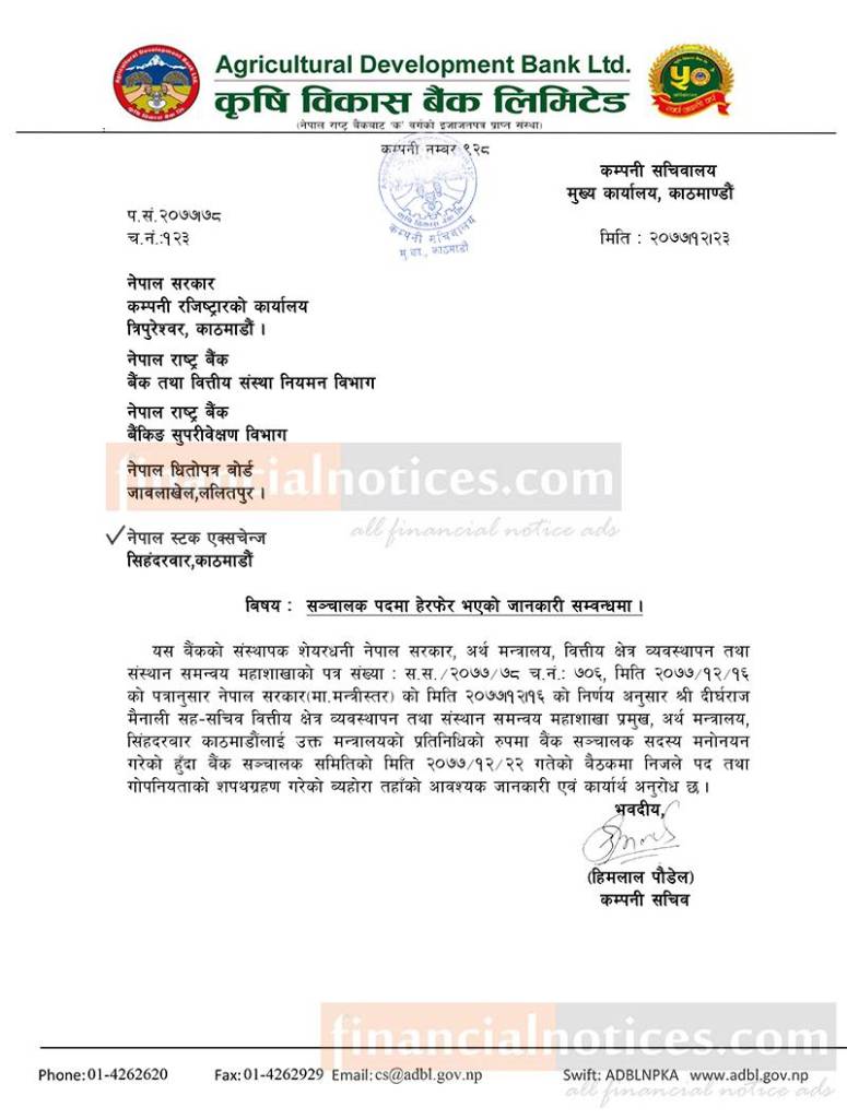 कृषि विकास बैंकको सञ्चालकमा दीर्घराज मैनाली नियुक्ति भएको बारे सूचना