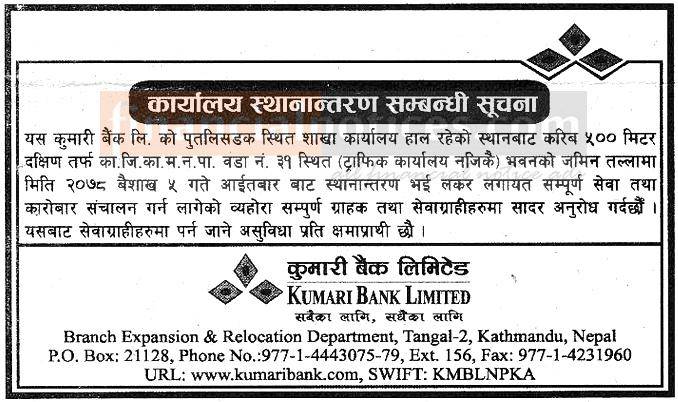 Published by Kumari Bank Ltd (KBL) Official Page on 2078-1-05
