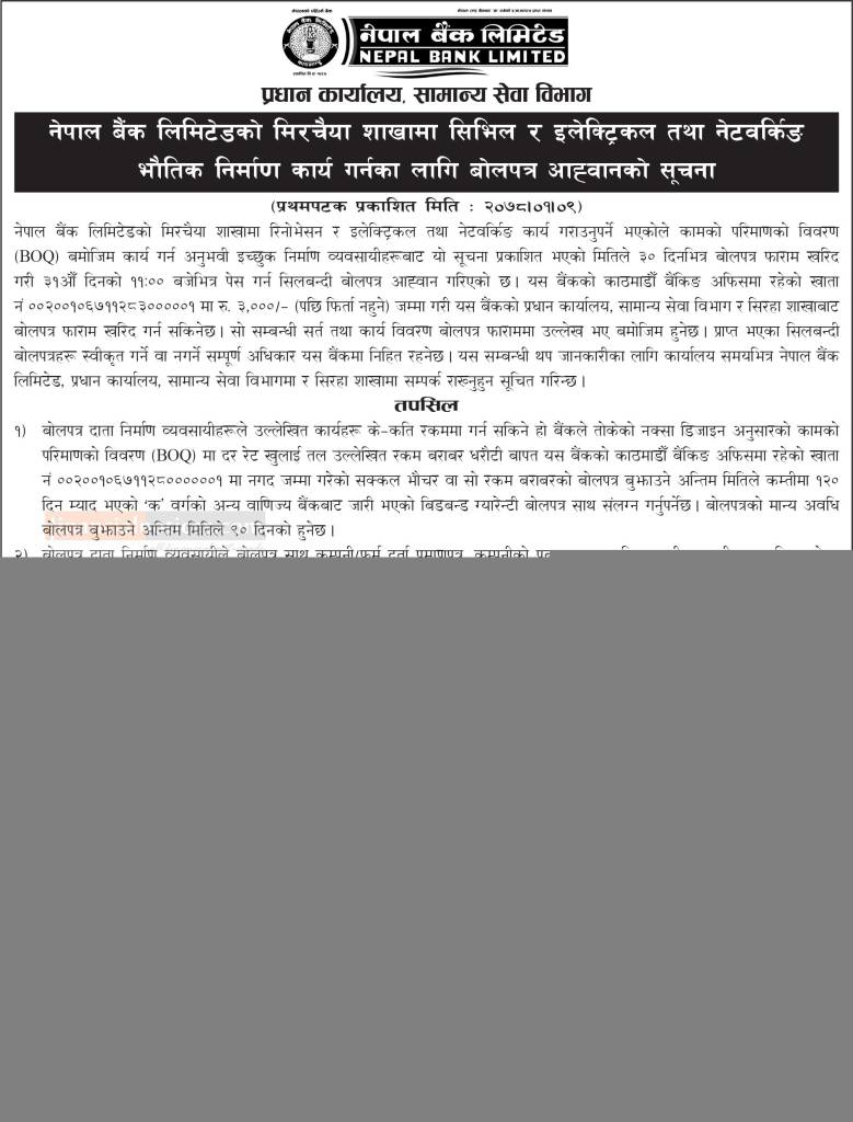 मिरचैया शाखामा सिभिल र इलेक्ट्रिक तथा नेटवर्किङ भौतिक निर्माण कार्यका लागि बोलपत्र आह्वानको सूचना