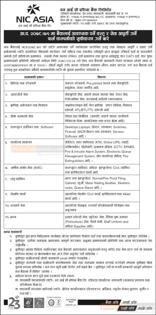 आ.व. २०७८/७९ मा बैंकलाई आवश्यक पर्ने वस्तु तथा सेवा आपूर्ती गर्ने फर्म कम्पनीको सूचीकरण गर्नेबारे सू