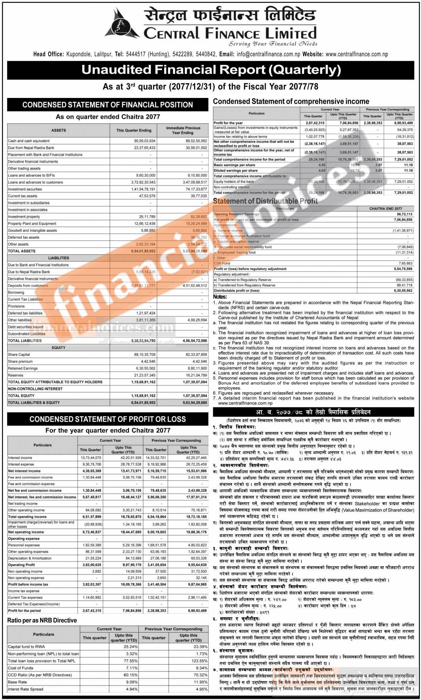सेन्ट्रल फाइनान्सको खुद नाफा ७ करोड ६ लाख रुपैयाँ