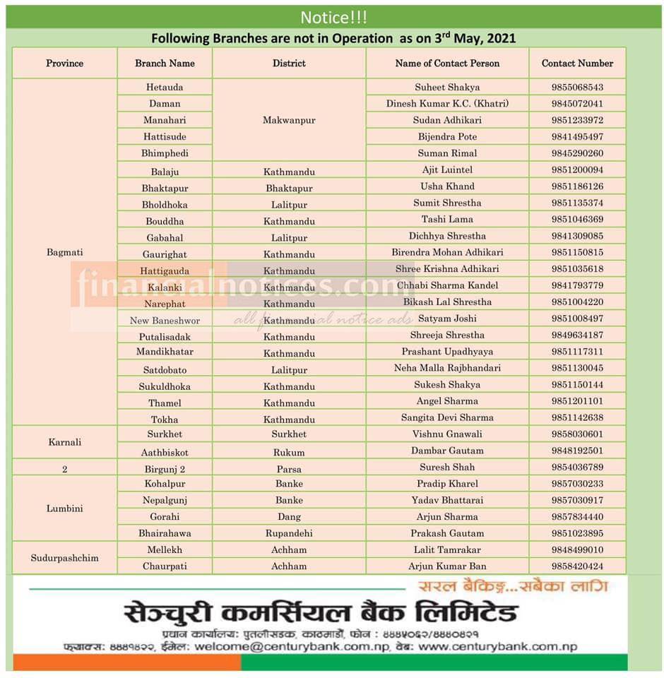 आज खुल्ला नरहने शाखा कार्यालयहरु बारे सेञ्चुरी बैंकको सूचना