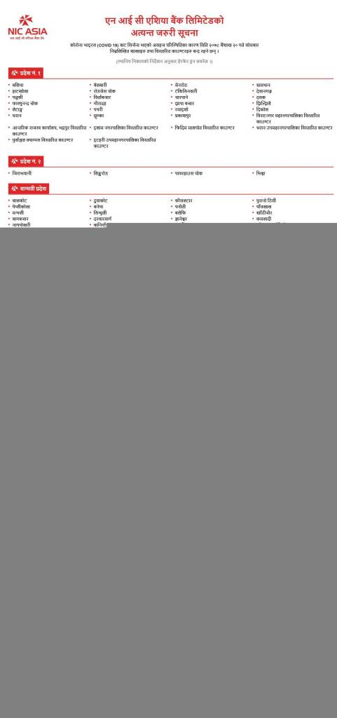 आज बन्द रहने शाखा कार्यालयहरु बारे NIC Asia बैंकको सूचना