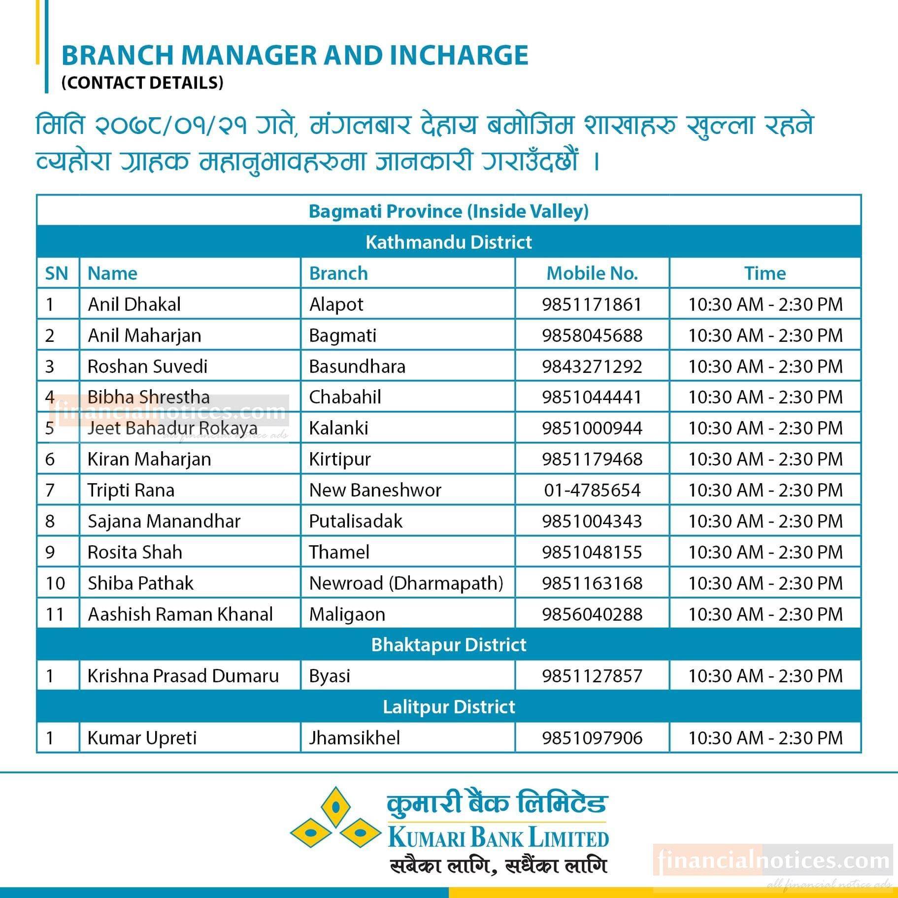 आज मंगलबार खुल्ला रहने शाखा कार्यालयहरु बारे कुमारी बैंकको सूचना