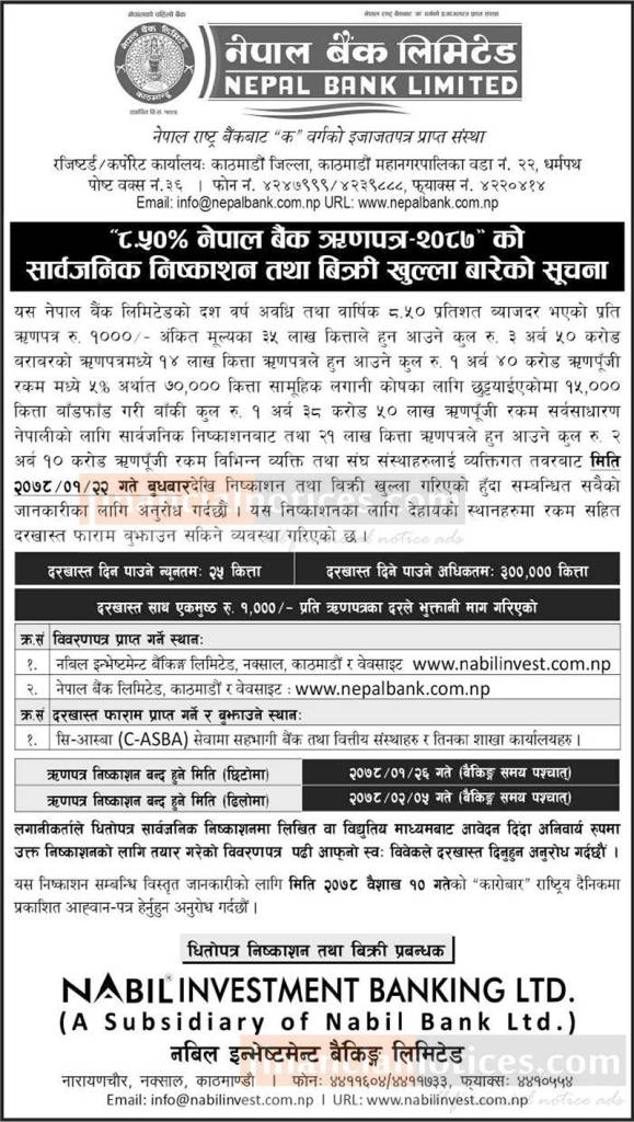 नेपाल बैंक ऋणपत्र सार्वजनिक निष्काशन तथा बिक्री खुल्ला बारेको सूचना
