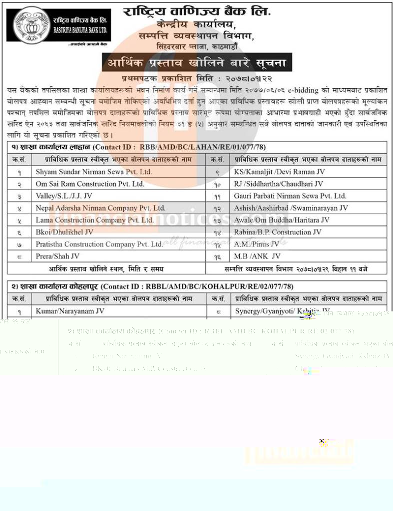 आर्थिक प्रस्ताव खोलिने बारेको सूचना