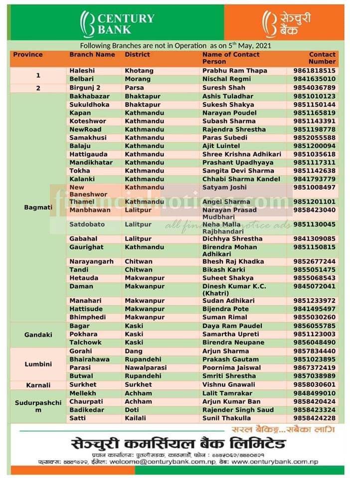 आज खुल्ला नरहने शाखा कार्यालयहरु बारे सेञ्चुरी बैंकको सूचना