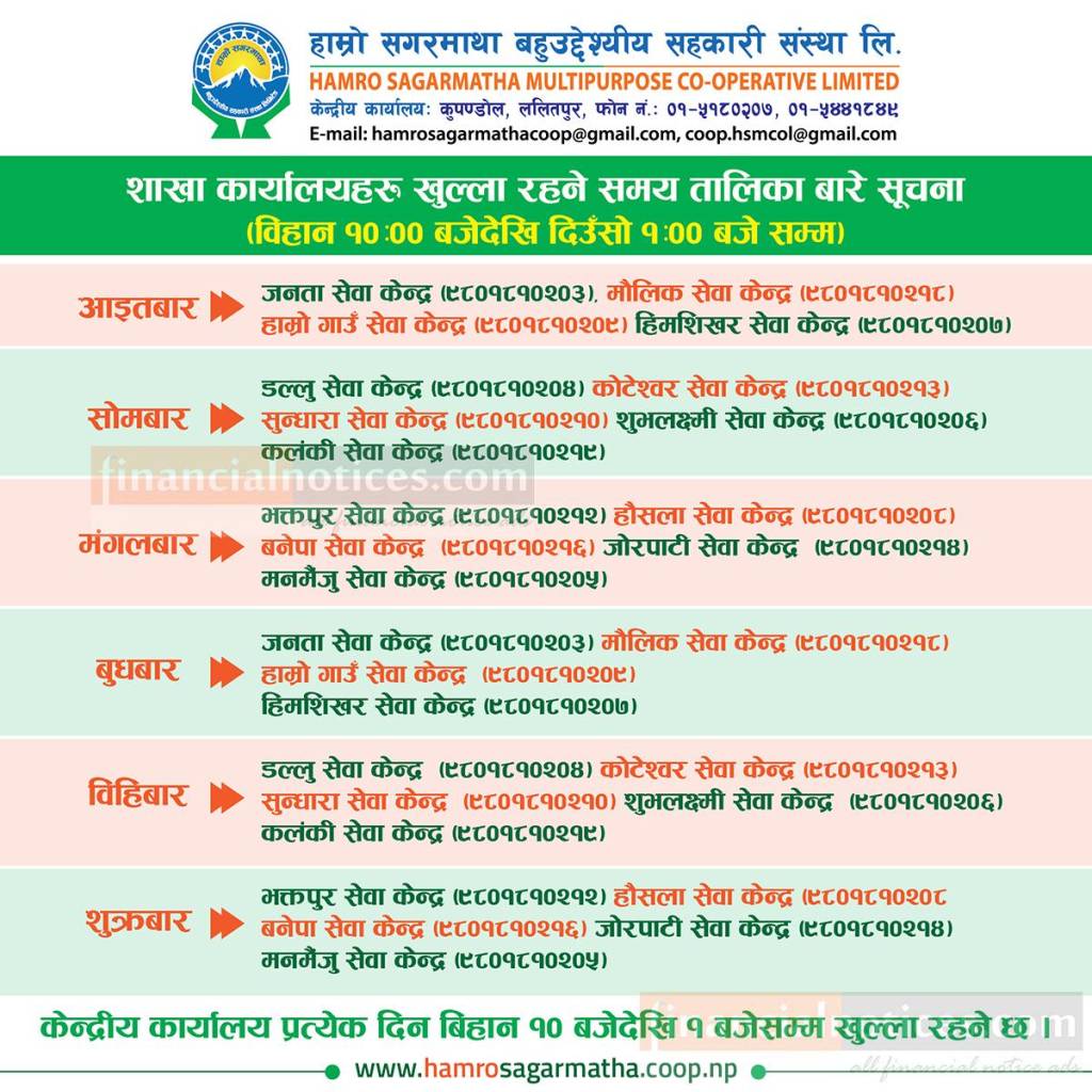 शाखा कार्यालयहरु खुल्ला रहने समय तालिका बारे सूचना