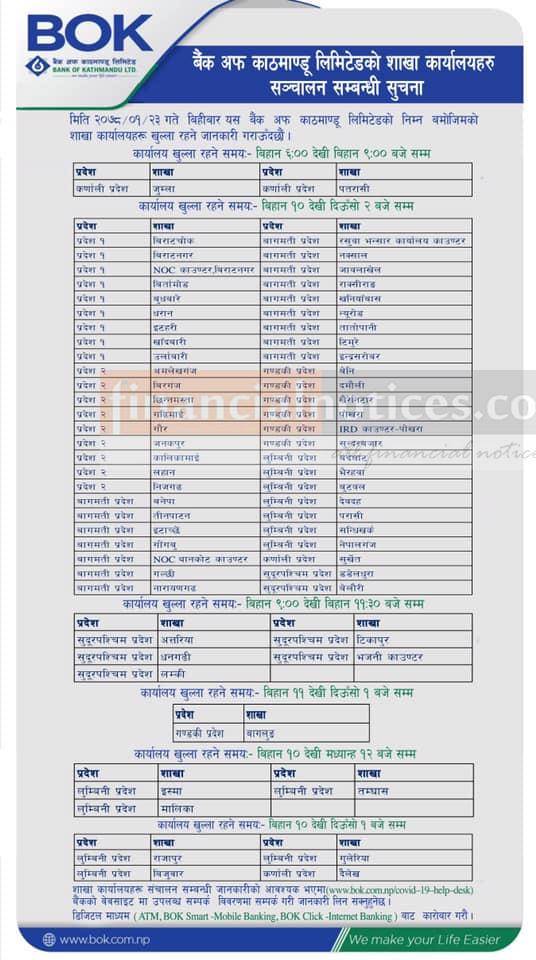बैंक अफ काठमाण्डू लिमिटेडको शाखा कार्यालयहरू संचालन सम्बन्धी सूचना !!