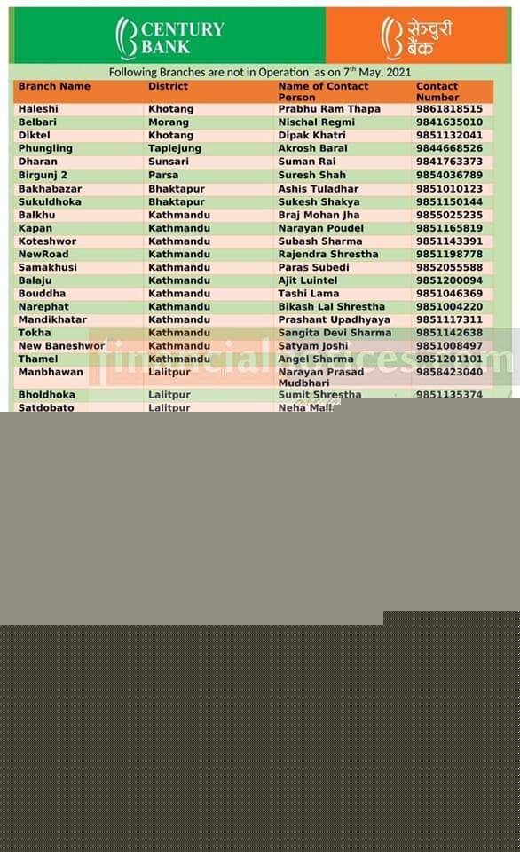 Century बैंकको खुल्ला रहने शाखाहरु