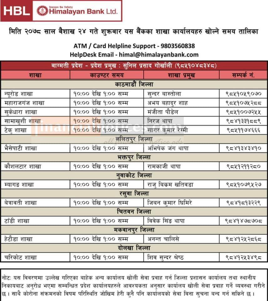 हिमालयन बैंकको आज खुल्ला रहने शाखा समयबारे सूचना