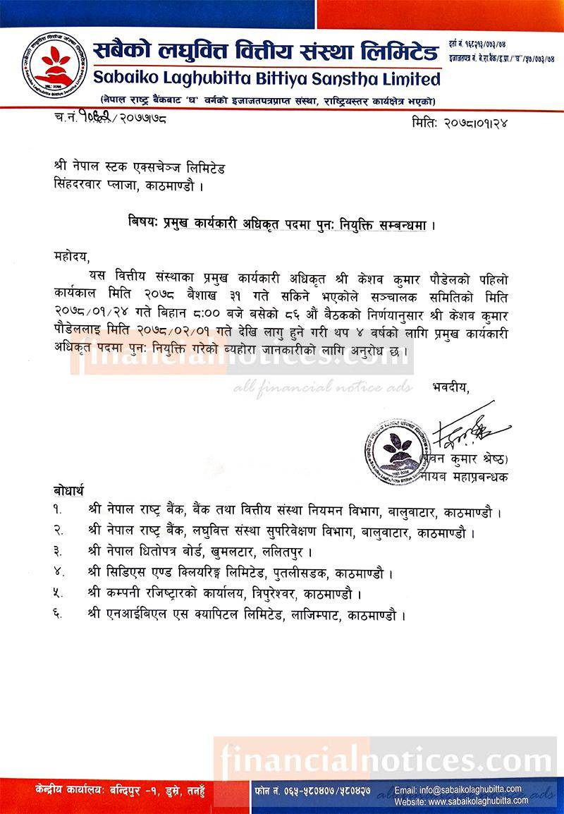 प्रमुख कार्यकारी पदमा पुन नियुक्ति सम्बन्धी सूचना