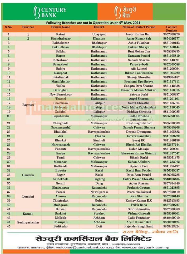 Century बैंकको खुल्ला रहने शाखाहरु