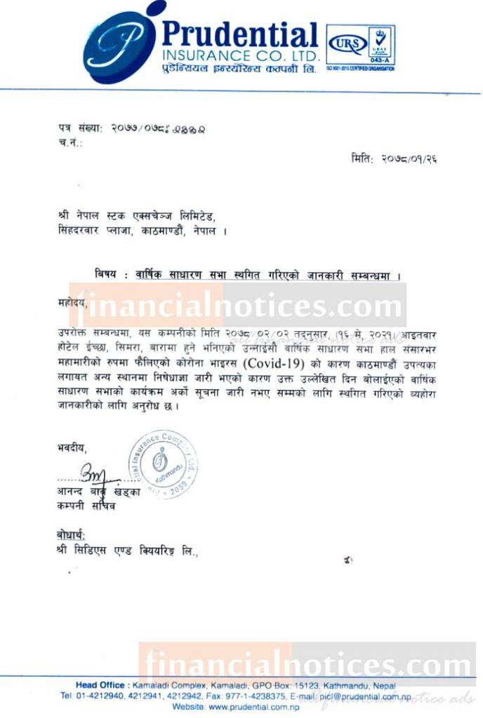 प्रुडेन्सियल इन्स्योरेन्सको साधारणसभा स्थगित भएको बारे सूचना