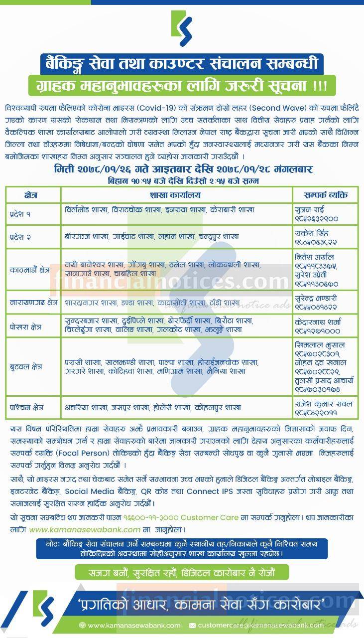 कामना सेवा विकास बैंकको खुल्ला रहने शाखासमयबारे सूचना