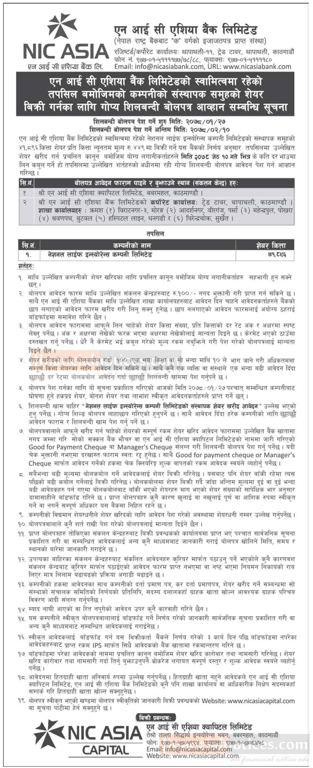 नेसनल लाइफ इन्सुरेन्सको सेयर लिलामी सम्बन्धी सूचना (Promoter Share Auction Notice)
