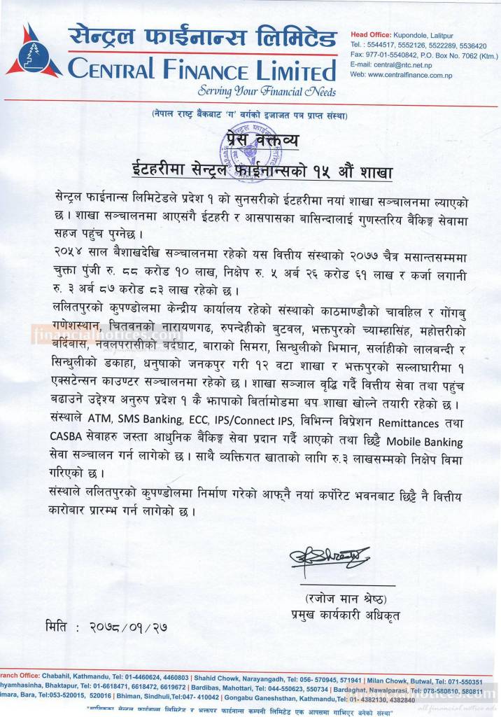 इटहरीमा सेन्ट्रल फाइनान्सको १५ औं शाखा कार्यालय सञ्चालन सम्बन्धी सूचना