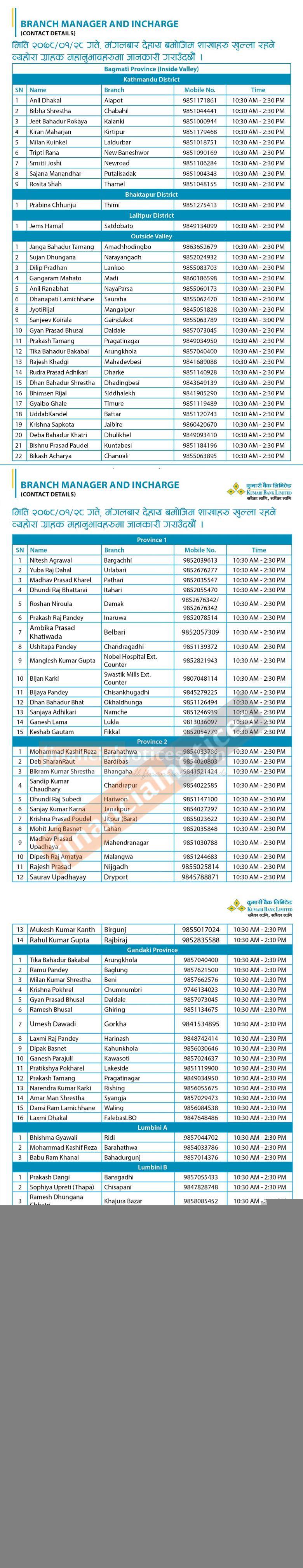कुमारी बैंकको शाखाहरु खुल्ला रहने बारेको सूचना (Province 1-7)