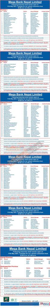 मेगा बैंकको आज खुल्ला रहने शाखा समयबारे सूचना (Banking Hours Province 1-7)