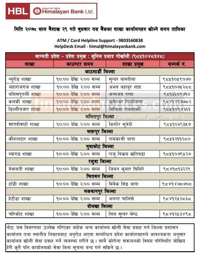 हिमालयन बैंकको आज खुल्ला रहने शाखा समयबारे सूचना