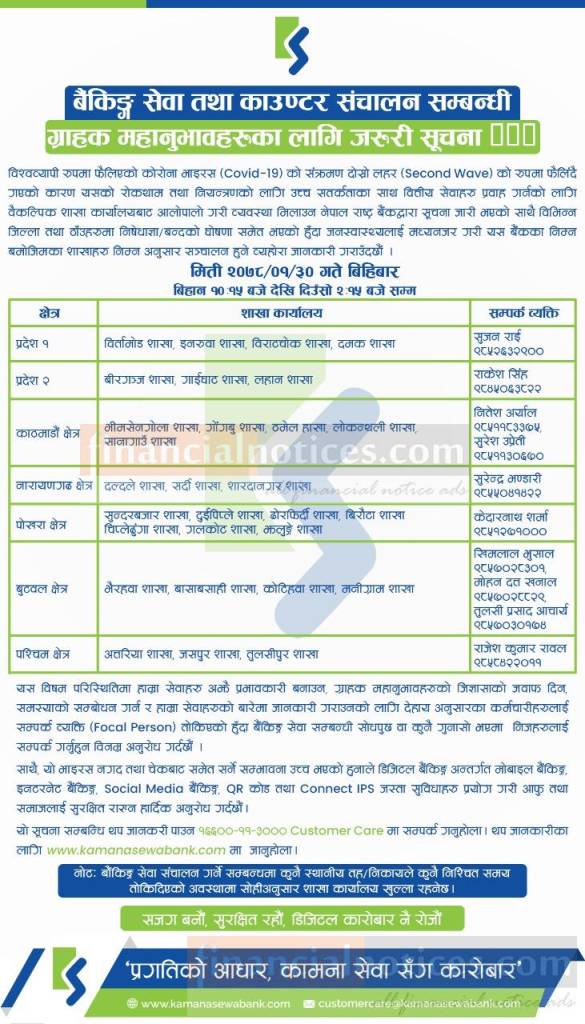 कामना सेवा विकास बैंकको खुल्ला रहने शाखासमयबारे सूचना