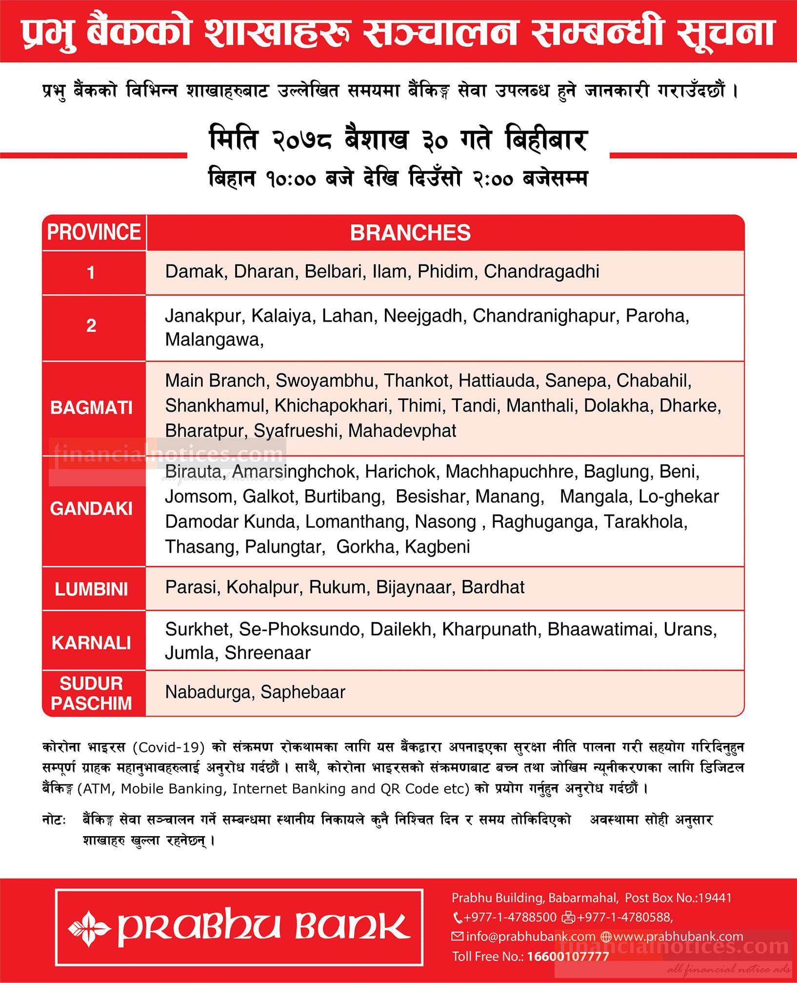 प्रभु बैंकको ३० गते विहिबार निम्न शाखाहरु खुल्ला रहने सूचना!