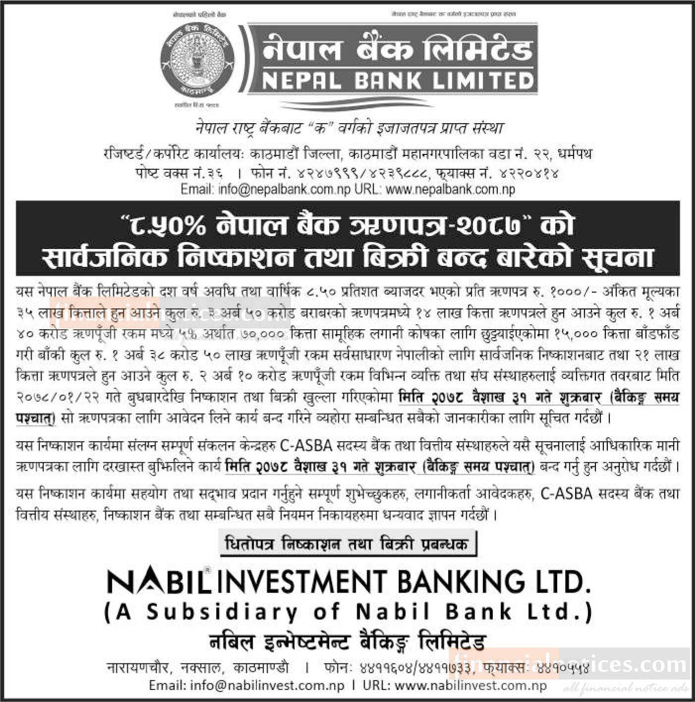 ८.५ % नेपाल बैंक ऋणपत्र- २०८७ को सार्वजनिक निष्काशन तथा बिक्री बन्दको सूचना