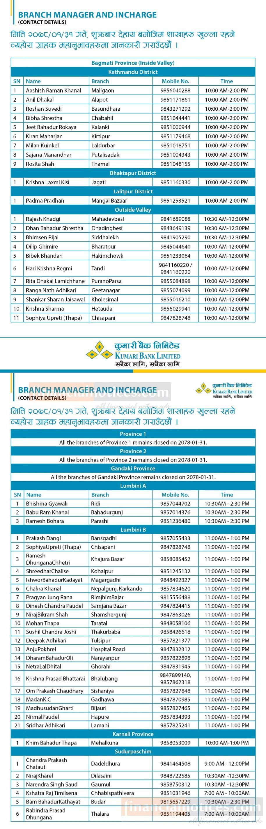 मिति २०७८/०१/३१ गते, शुक्रबार खुल्ला रहने शाखाहरु बारे सूचना