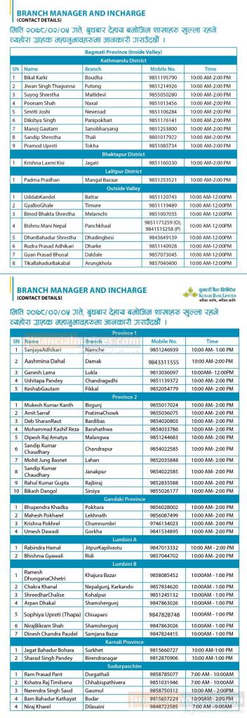 कुमारी बैंकको शाखाहरु खुल्ला रहने बारेको सूचना (Province 1-7)