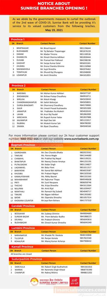 सनराइज बैंकको शाखाहरु खुल्ला रहने सूचना