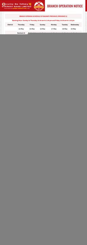 एभरेष्ट बैंकको आज खुल्ला रहने शाखा समयबारे सूचना