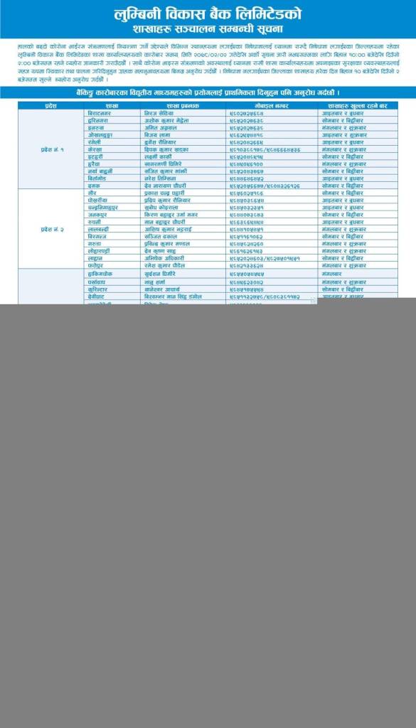 Lumbini Bikas Bank को शाखाहरु खुल्ला रहने सूचना