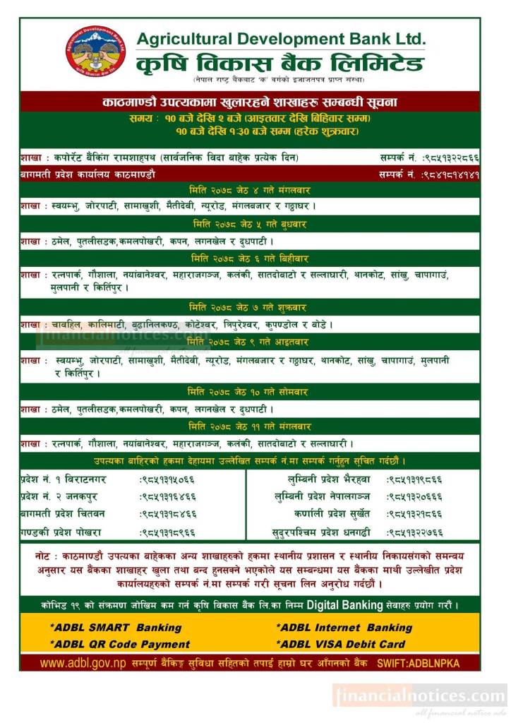 कृषि विकास बैंकको आज खुल्ला रहने शाखाहरु