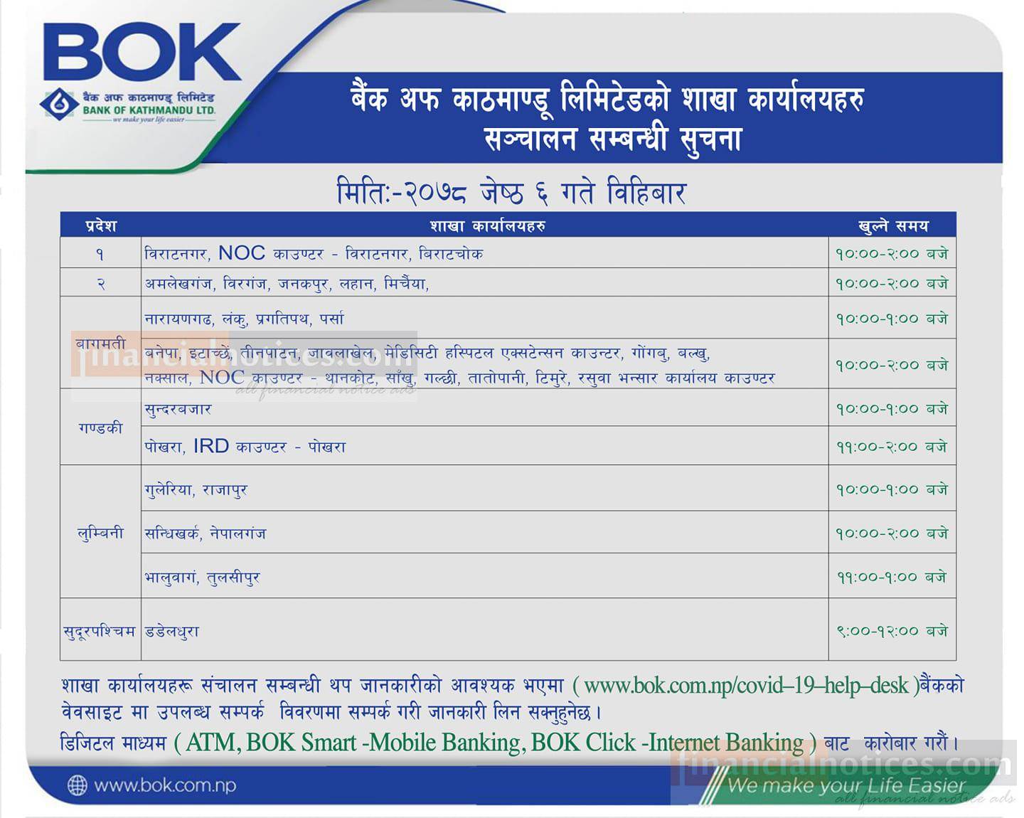 बैंक अफ काठमाण्डू लिमिटेडको शाखा कार्यालयहरू संचालन सम्बन्धी सूचना !!