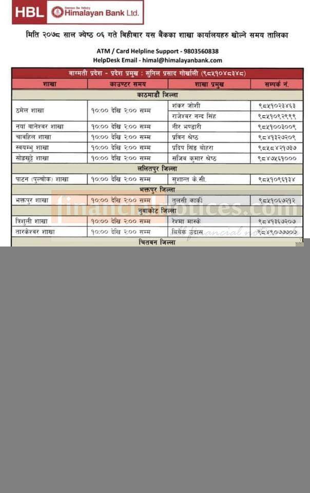 हिमालयन बैंकको आज खुल्ला रहने शाखा समयबारे सूचना