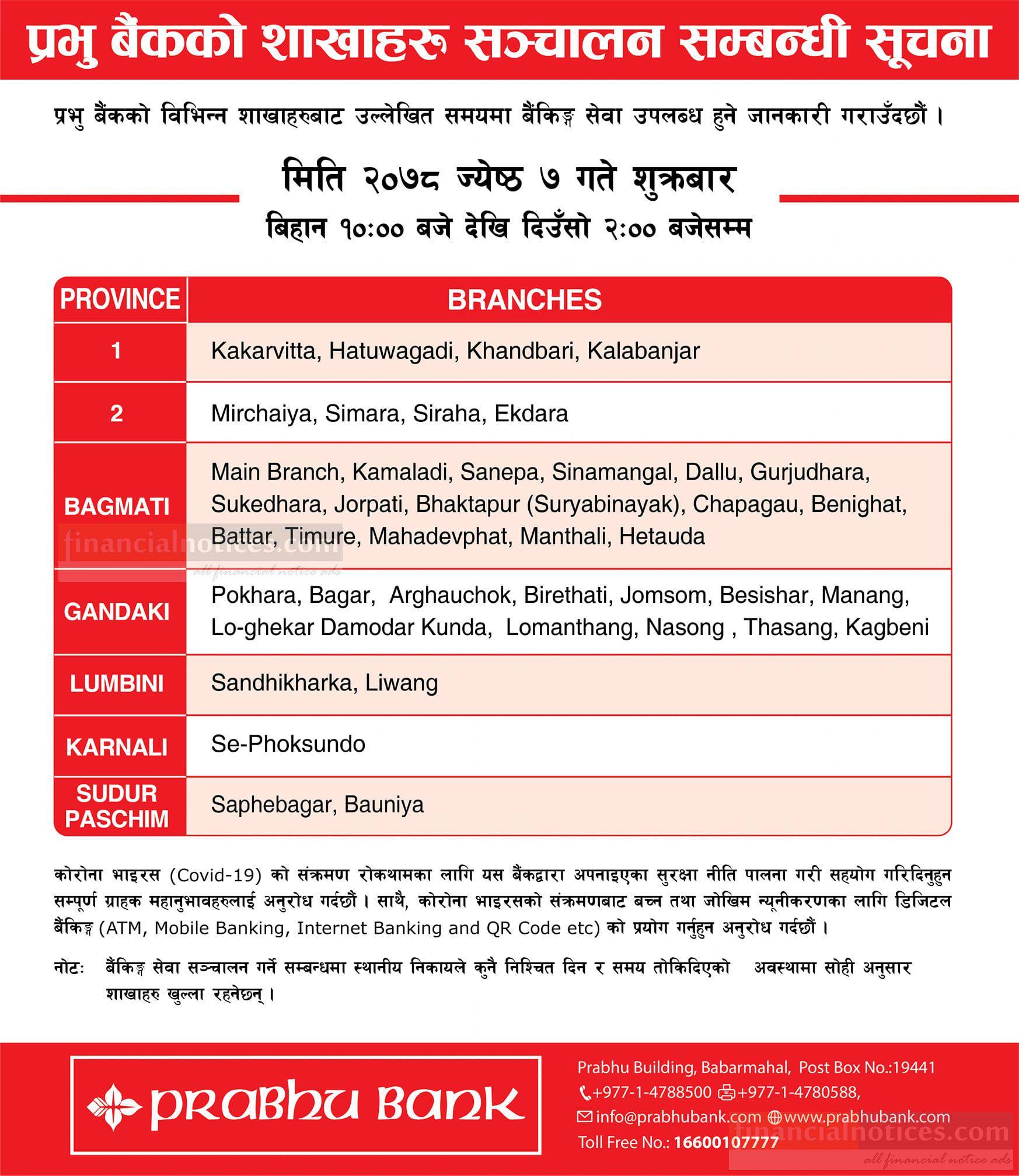 प्रभु बैंकका निम्न शाखाहरु खुल्ला रहने सूचना!