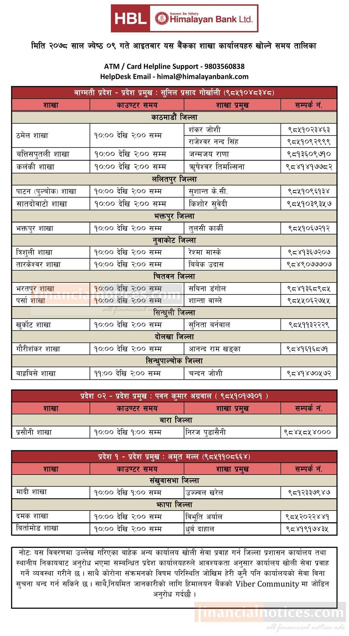 हिमालयन बैंकको आज खुल्ला रहने शाखा समयबारे सूचना