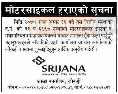 मोटर साईकल हराएको सूचना- Bike Lost Notice