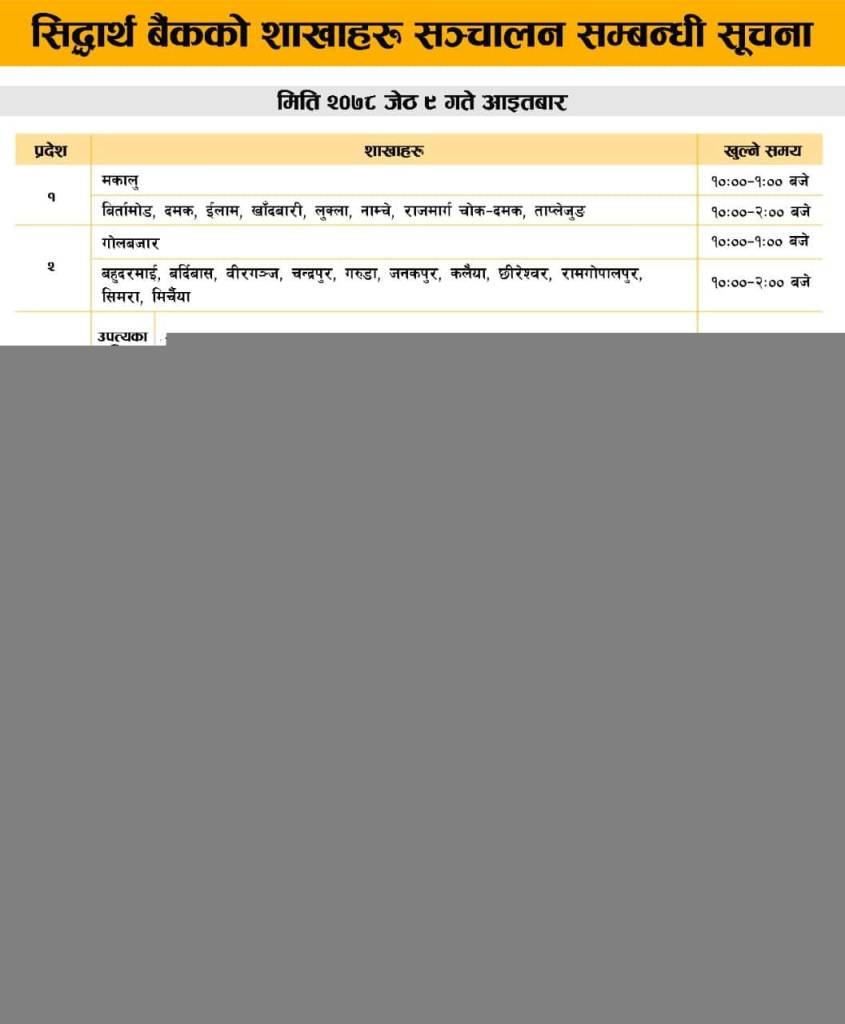सिद्धार्थ बैंकको शाखाहरु संचालन सम्बन्धी सूचना