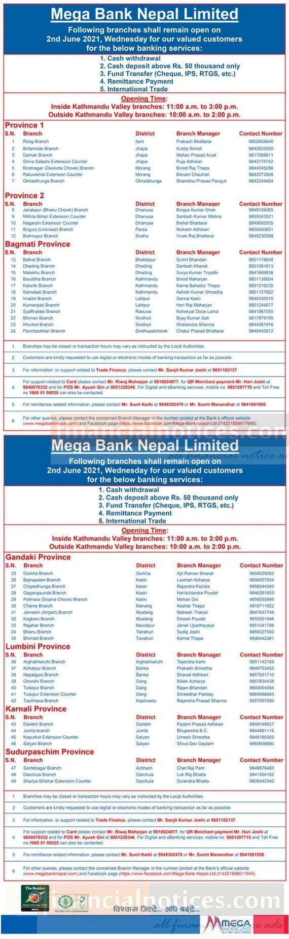 मेगा बैंकको आज खुल्ला रहने शाखा समयबारे सूचना (Mega Banking Hours)