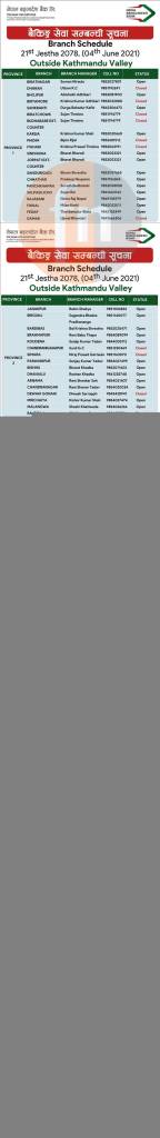 Notice for inside valley branch opening schedule for Jestha 21, 2078.