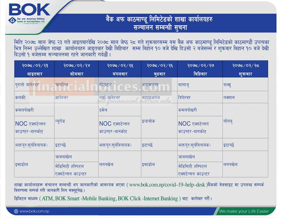 बैंक अफ काठमाण्डू लिमिटेडको शाखा कार्यालयहरू संचालन सम्बन्धी सूचना !!