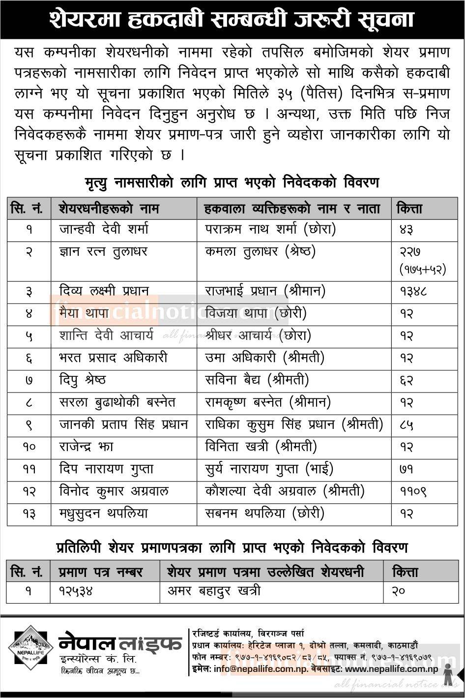 शेयरमा हकदावीको सूचना