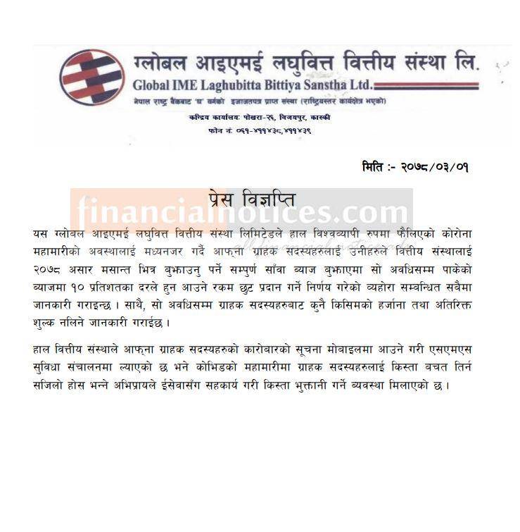 ग्लोबल आइएमई लघुवित्तले ब्याजमा १०% छुट दिनेबारे सूचना