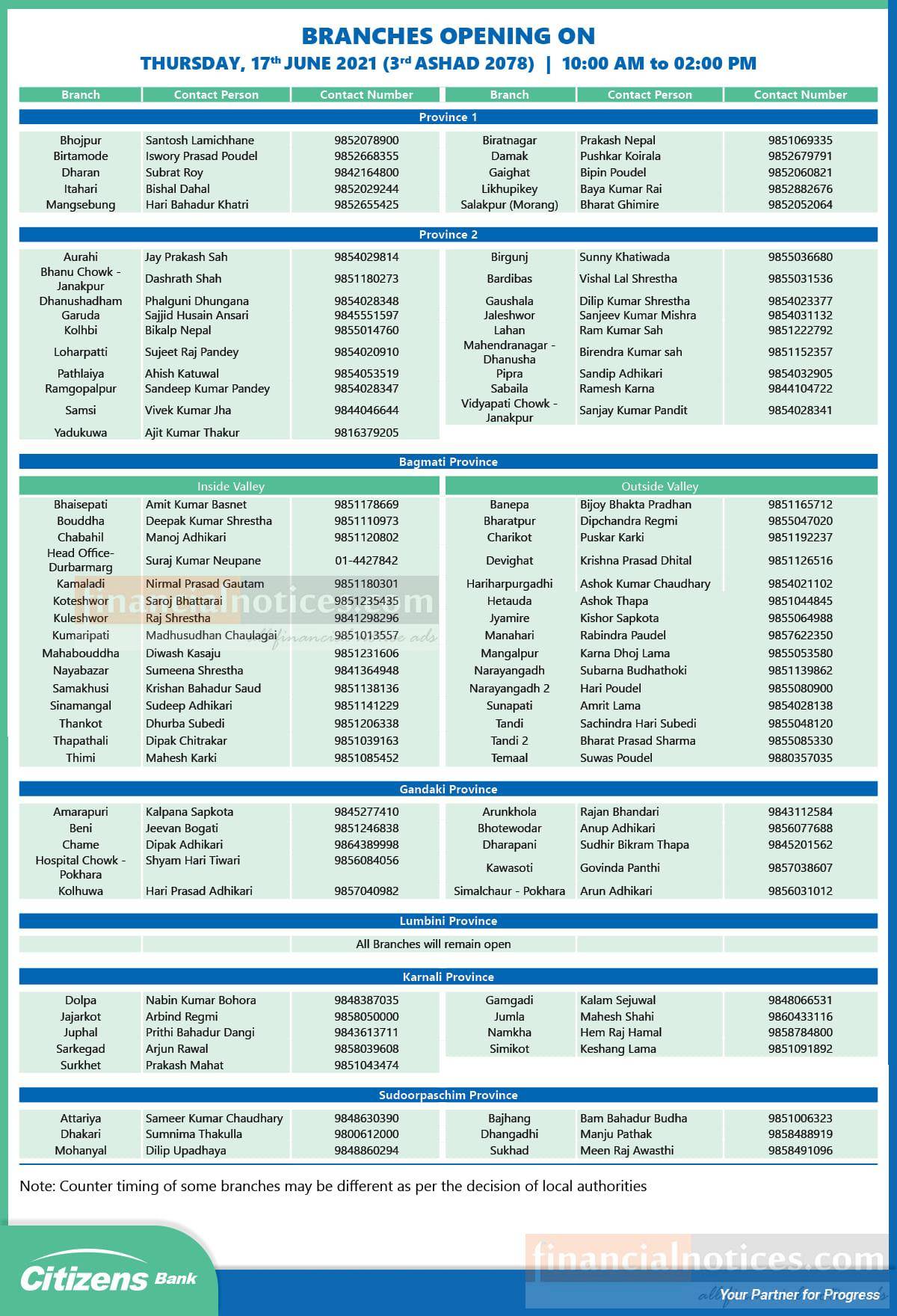 Citizens बैंकको खुल्ला रहने शाखाहरु