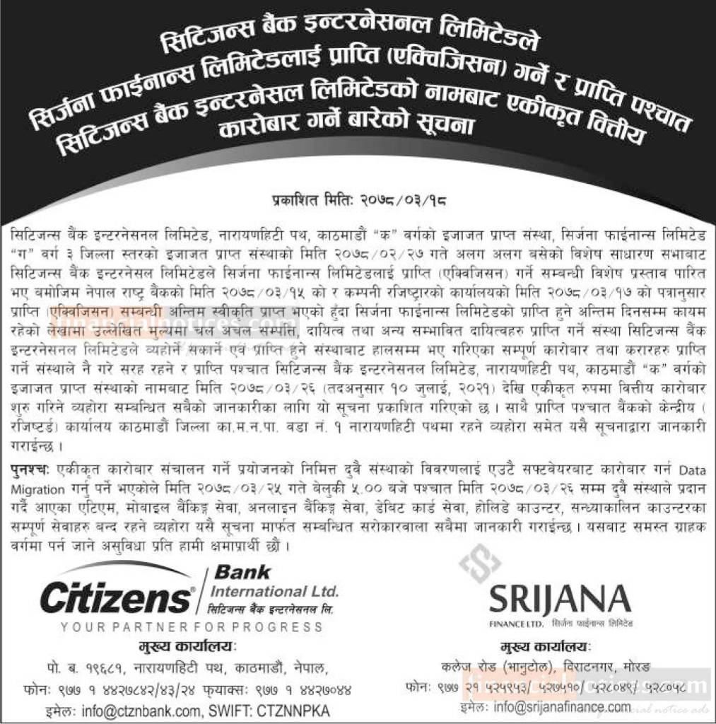 सिर्जना फाइनान्सलाई प्राप्ती पश्चात सिटिजन्स बैंकको नाममा एकिकृत वित्तीय कारोबार गर्ने बारेको सूचना