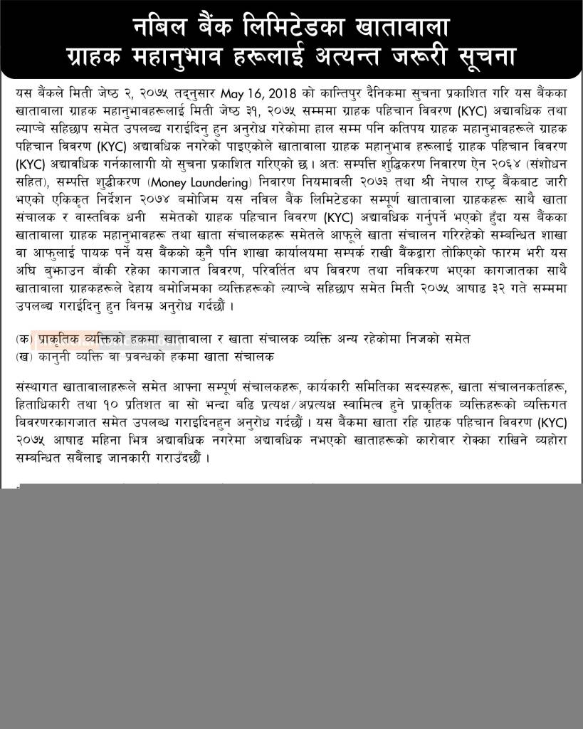 नविल बैंकका ग्राहकहरुलाई जरुरी सूचना