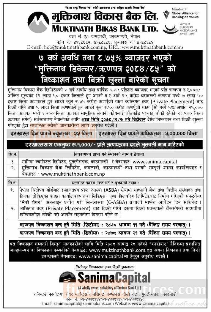 मुक्तिनाथ डिबेन्चर/ऋणपत्र २०८४/८५ को निष्काशन तथा बिक्री खुल्ला बारे सूचना