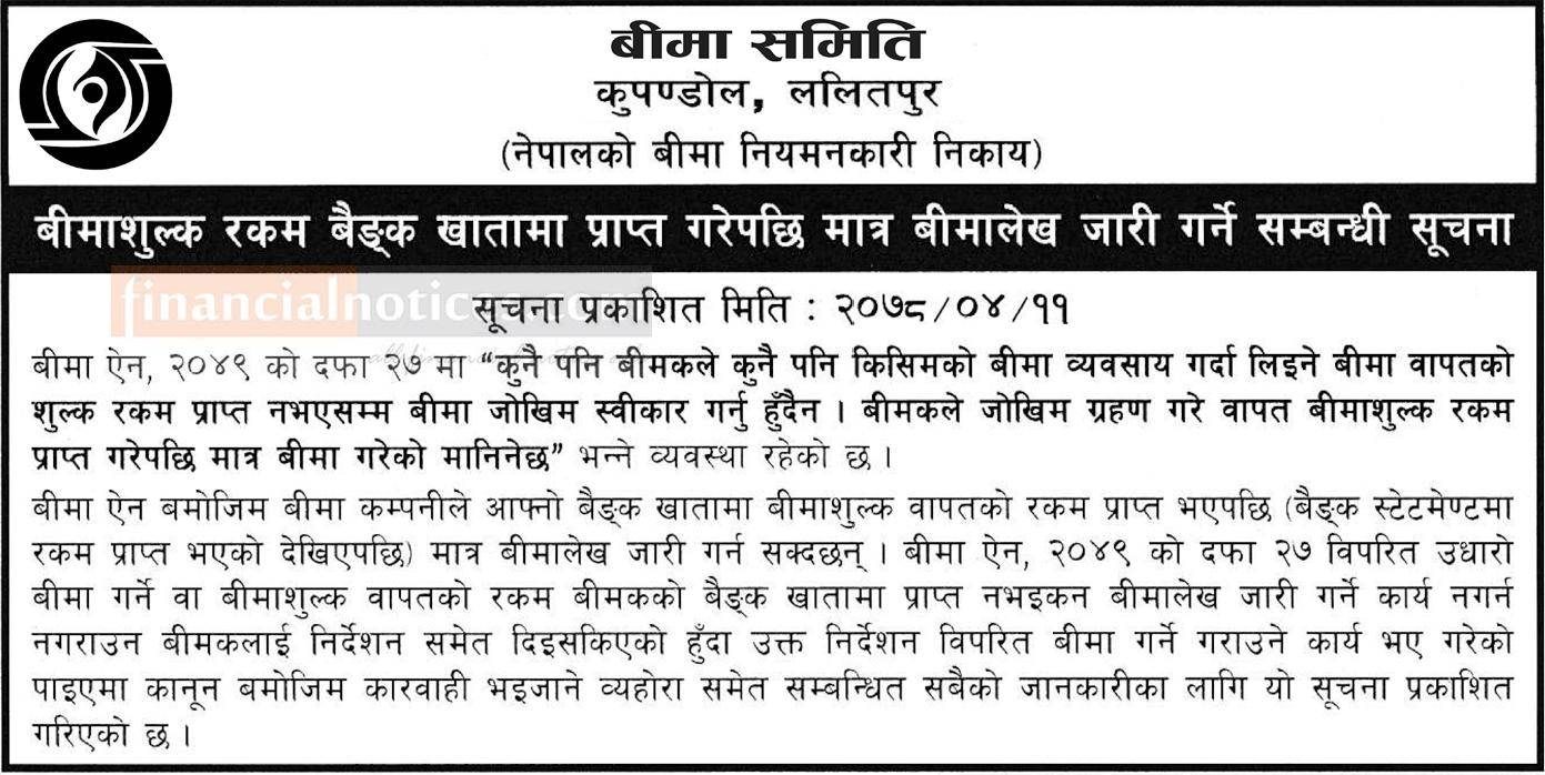 बीमाशुल्क रकम बैंक खातामा प्राप्त गरेपछि मात्र बीमालेख जारी गर्नेबारे सूचना